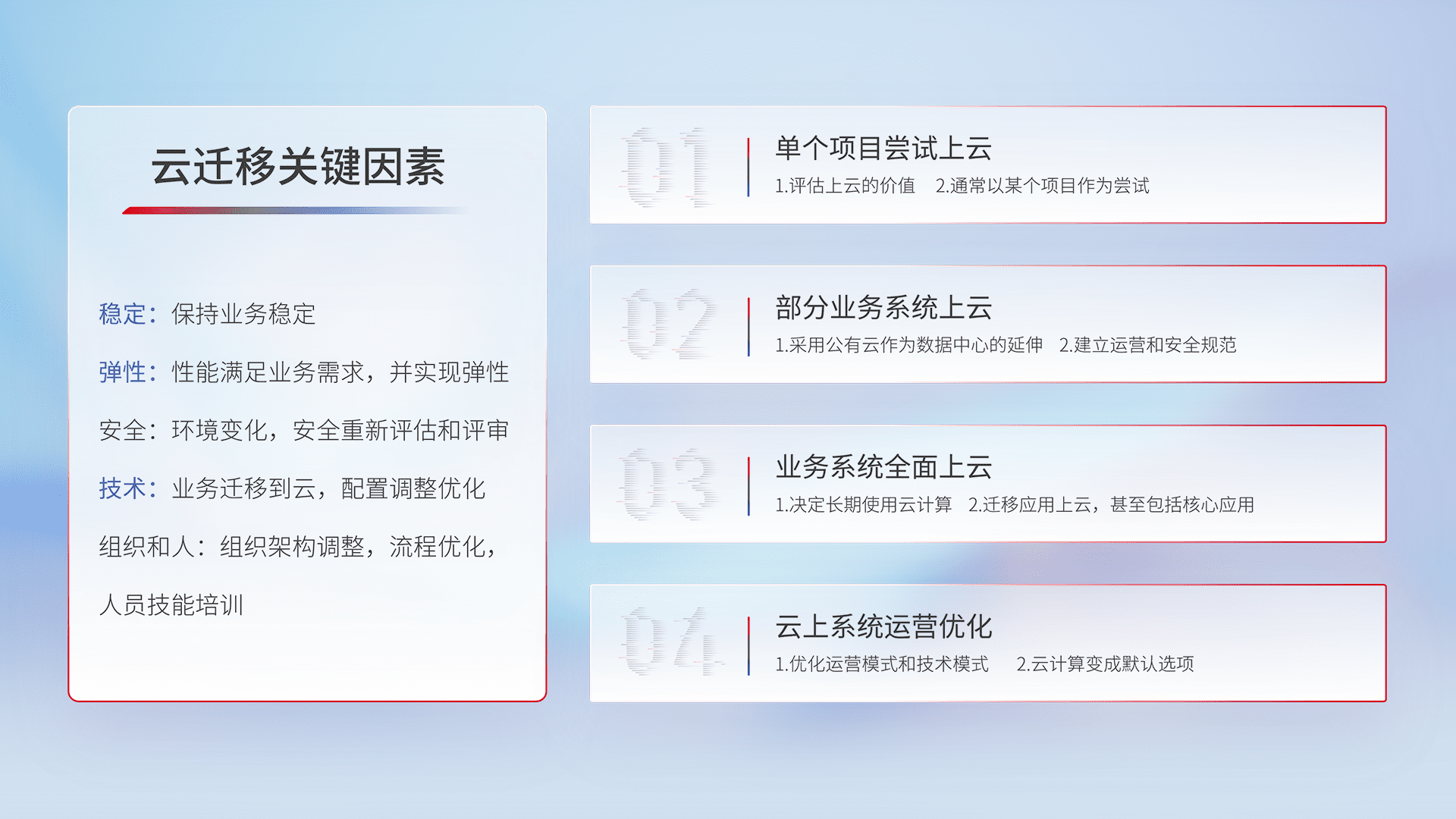 结合实际业务,,,,从规划设计、、、云平台选型、、、云原生改造、、数据迁移、、、、集成交付,,,迁移全过程为客户识别最佳上云路径,,,,做好风险识别管理,,设计网络架构、、、身份权限、、、安全审计合规、、、操作审计、、日志审计、、、、监控告警策略、、、多站点容灾设计等,,,,对云上基础设施进行整体规划,,,提升IT治理水平,,,,以满足弹性、、、高可用、、高性能的需求。。。。